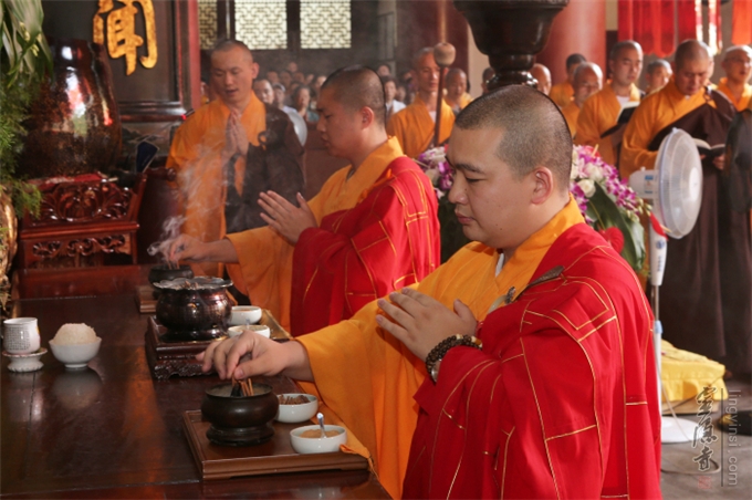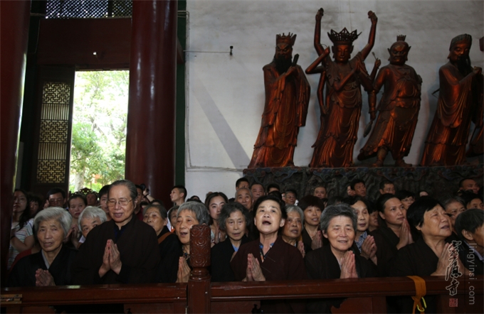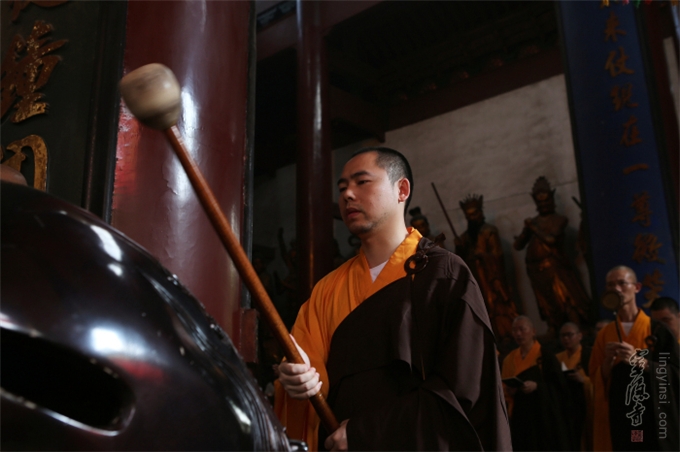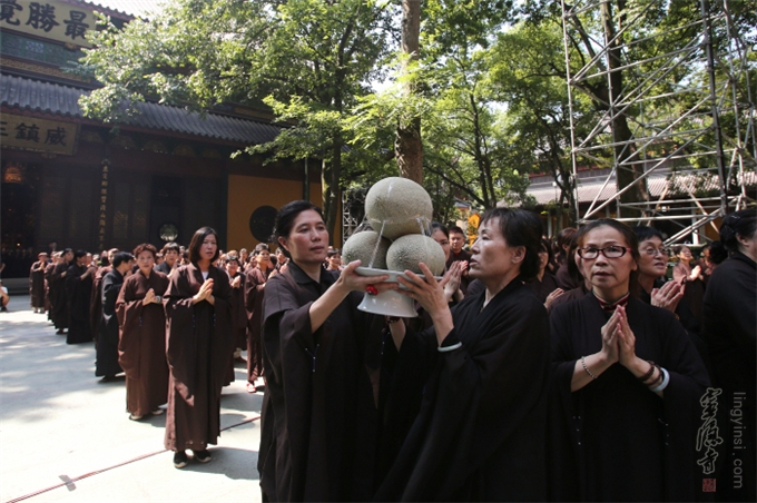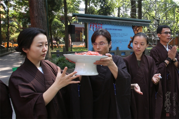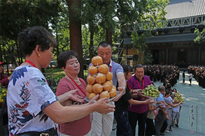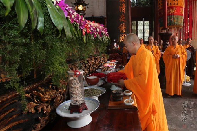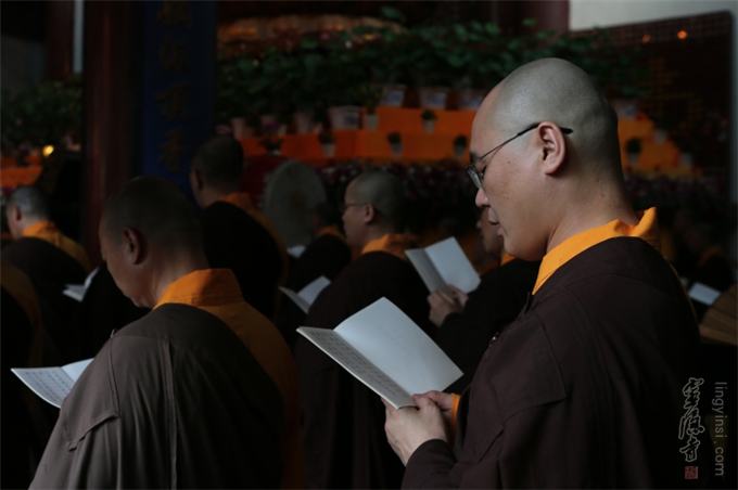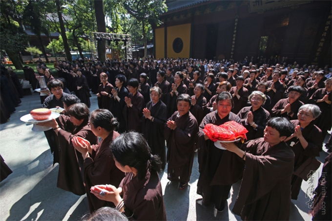 佛教的盂兰盆节,不重祭祀,而侧重于孝亲报恩、慎终追远的精神内涵。诵经、传供是灵隐寺举办盂兰盆法会的传统老形式,法师们旨在通过这种方式,感恩佛陀教给众生如何孝敬父母六亲的功德,也以诵经礼佛的功德,为与会善信超荐七世父母及过往冤亲,并回向法界众生,同祈世界和平、人民安乐。