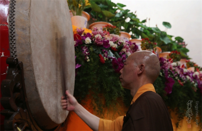 在传供现场,近两百人的传供队伍列为两队,从大雄宝殿开始,一直排到天王殿前。穿着僧衣的法师,披着海青的居士,还有民众共同参加了传供法会。香花果品,百味饮食,香油锭烛,一应供养器物,从僧俗弟子一双双手中传递,最后呈供到鲜花布满的佛前。