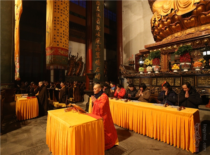 2018年2月23日,农历正月初九,灵隐寺举行戊戌新春斋天祈福法会,灵隐寺两序大众、十方善信齐聚大雄宝殿,虔诚设供焚香,诵经礼拜。祈愿海众安和,国泰民安,风调雨顺,人民安乐。