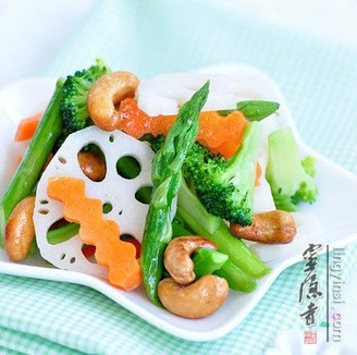 4、锅中再倒油,热后倒入所有蔬菜,快速翻炒下后调入白糖、盐和香油炒匀。最后倒入腰果,炒匀即可。