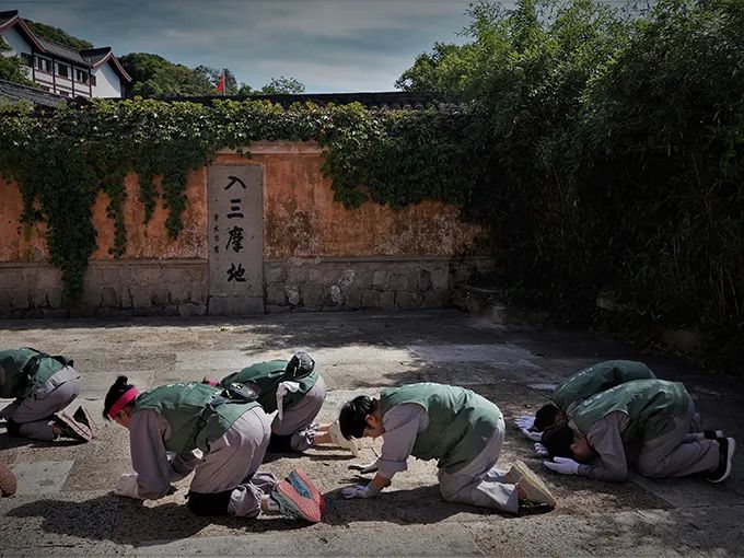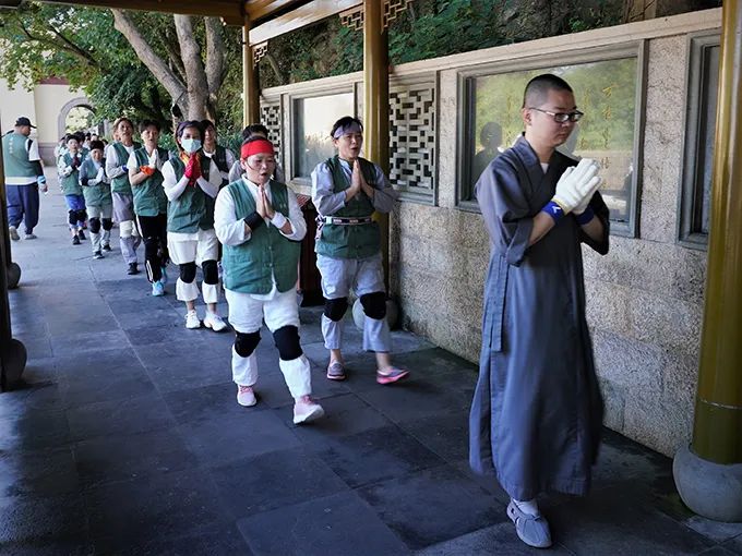 途中渐渐体力不支,正想要退却偷懒,想到昨天在菩萨面前的发愿,看到师兄们动作整齐的三步一拜,既感动又惭愧。我怎么会萌生半途而废的念头?师兄们的精进,也激励着我。顾不得道路的坚硬不平,顾不上滴落的汗水,把呼吸调整,合着队伍的节奏,虔诚地称念礼拜观世音菩萨。