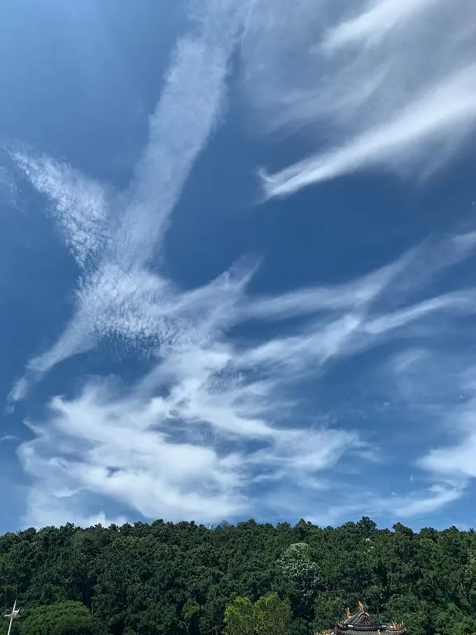 一到普陀山,走出游客码头,抬头便望见蔚蓝色天空祥云漫天,特别两团巨大的祥云神似龙与凤,在空中对视。同行的师兄们异口同声发出:“啊!龙凤呈祥,好兆头!”