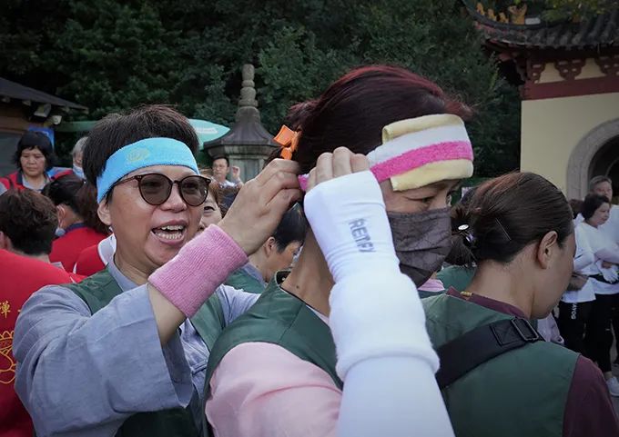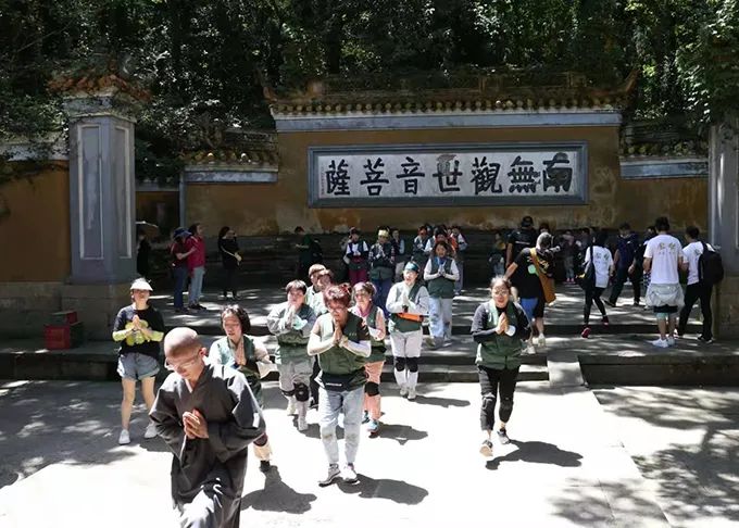 六月初六,阳光明媚,早上八点我们在普陀山码头山门牌坊集合、起香,三步一拜沿着上香古道——妙庄严路一路开始拜山。