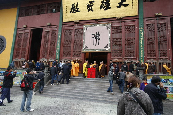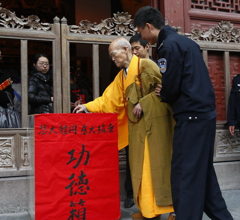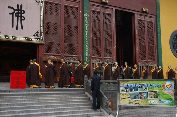 11点30分,刚刚过完堂的我寺法师们一路高唱"南摩救苦救难观世音菩萨"的圣号,列队前往大雄宝殿回向,并祈祷诸佛菩萨、护法龙天护佑灾区人民。上午尚阴沉的天空,此时下起了沥沥浠浠的小雨。大众法师们依次走到功德箱前捐款,以秉承"十方供养,十方布施"的佛教理念。在法师们的感染下,许多游客信众纷纷慷慨解囊,随喜助缘。