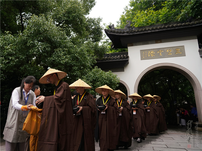 上午八点,在杭州市佛协会长、灵隐寺方丈光泉大和尚的带领下,来自杭州市属各大寺院、杭州佛学院以及灵隐寺、三天竺法镜讲寺求受三坛大戒的戒子等1000名僧人,依照佛制,著衣持钵,头戴斗笠,开始了"托钵行脚"活动。