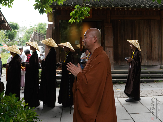 僧人们统一头戴竹笠、身披衲衣、手托钵盂、脚踏芒鞋,步伐稳健,神态安详。
