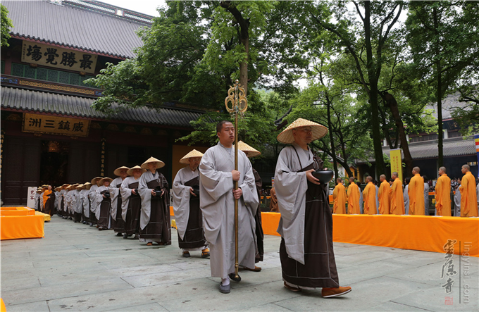 浴佛法会后,在市佛协会长、灵隐寺方丈光泉大和尚的带领下,来自杭州各区县(市)、市属寺院、佛学院的500余位僧人,依照佛制,著衣持钵,头戴斗笠,隆重举行"2017东南佛国.杭州托钵行脚——福慧行"大型佛教慈善活动。托钵队伍由上天竺法喜讲寺出发,沿天竺路,途经中天竺法净禅寺、三天竺法镜讲寺至灵隐寺,托钵乞食,与众结缘。托钵队伍以如律如仪的僧相来表法;以清净和合的僧团形象诠释当代佛教;以托钵行脚的佛教传统来化育大众,再现佛陀带领僧团修学的历史场景。