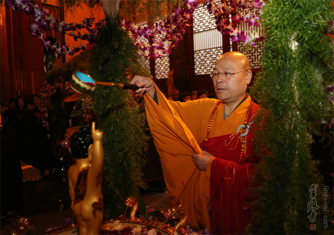今晨,灵隐寺举行隆重庄严的浴佛法会。大雄宝殿里,经声佛号,梵唱清扬。四众弟子,合掌礼赞,感恩本师释迦牟尼佛降生此娑婆世界。灵隐寺方丈光泉法师领众三勺,灌沐释迦太子金身。随后,众法师、居士、信众依次举勺,次第浴佛。