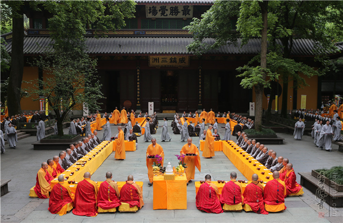 法会结束后,还举行了"云林茶礼"。佛教茶礼,自宋代东传日本之后,在中国逐渐式微,云林茶礼便是对佛教茶礼文化的再现。在灵隐寺大殿前的丛林之中,众僧趺坐,清净庄严,按照宋代佛教茶礼仪式,进行斋僧普茶,这便是具有灵隐寺特色的"云林茶礼"。