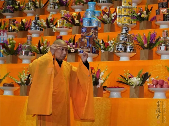 上午10点,传供祝圣祈福法会正式开始,杭州灵隐寺都监觉恒法师 监院义广法师拈香主法。四众弟子排班依次传供。当供品传过来时,人人伸手接过,将供品举至头顶缓缓传过,直至本师释迦牟尼佛供台上。