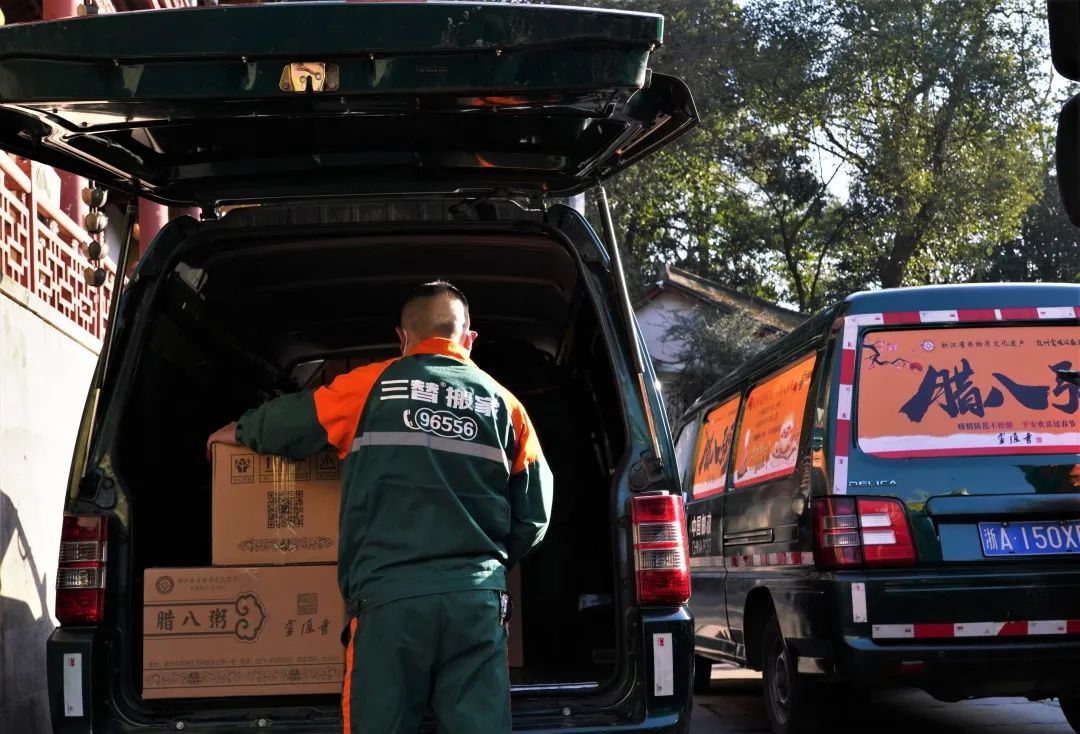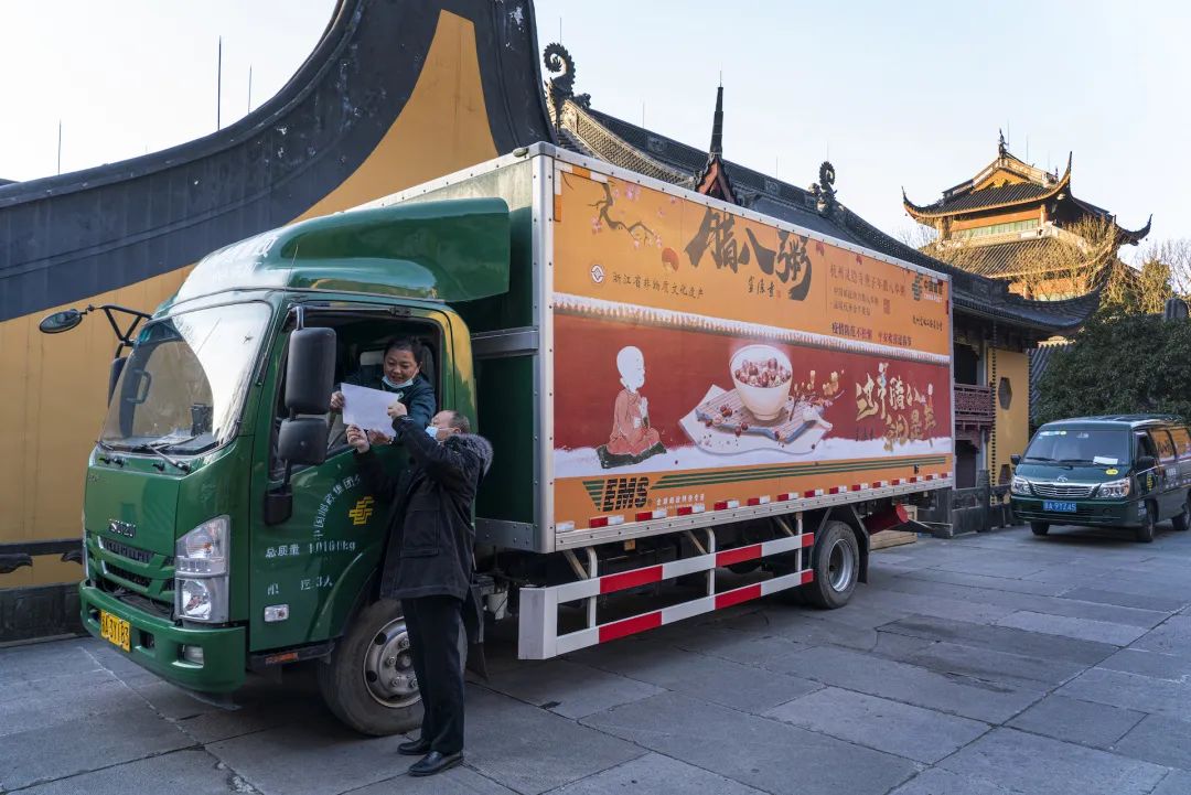 寺院用心做好一碗腊八粥的发心,赢得了许多热心人士和单位机构共襄盛举。除了志工群体的辛勤付出外,在腊八粥的物流环节,得到了中国邮政杭州分公司的大力支持。腊八节期间,六辆邮政速递车承载着灵隐寺的吉祥祝福,将温暖传递到街道社区、医院、养老院、工疗站等。