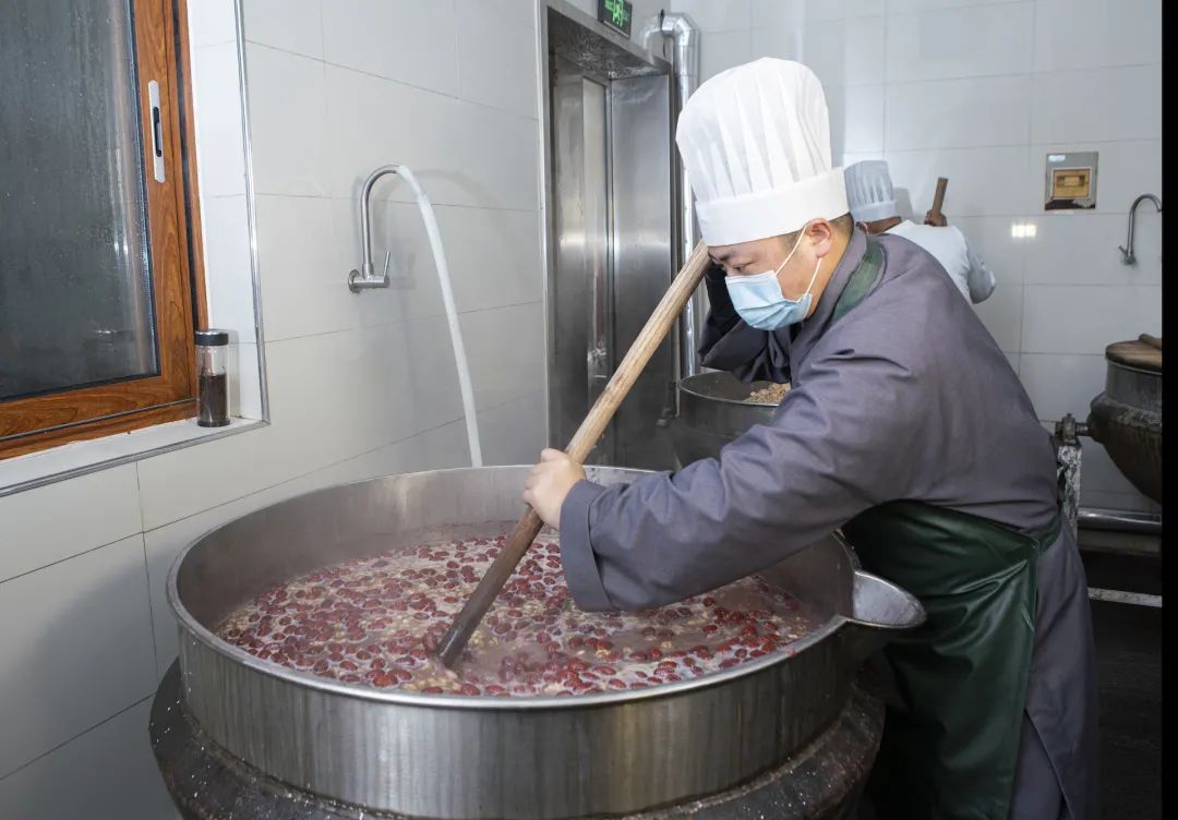 腊八粥熬煮:熬粥区的所有人员从头“武装”到脚,防护帽、白大褂、手套、口罩一样都不能缺!今年因为疫情,所有人员都做了核酸检测,防护工作做到一丝不漏。