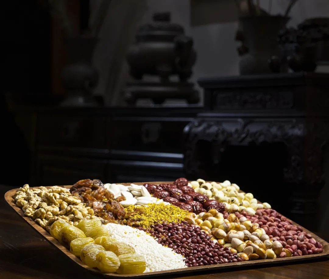 前期食材准备:灵隐寺腊八粥的食材,要用上12种:花生、红豆、莲子、桂圆、红枣、蜜枣、芸豆、白果、糯米、大米、白砂糖,外加少量桂花。