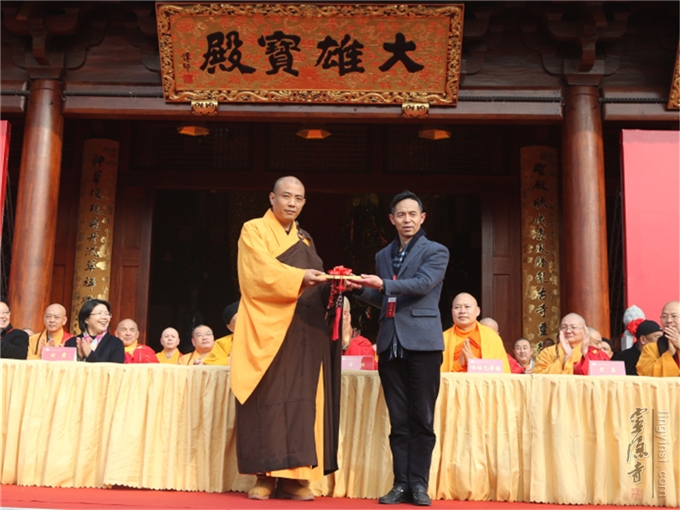 江阴市神华寺筹建委员会主任钱刚与神华寺监院净定法师做寺院交接