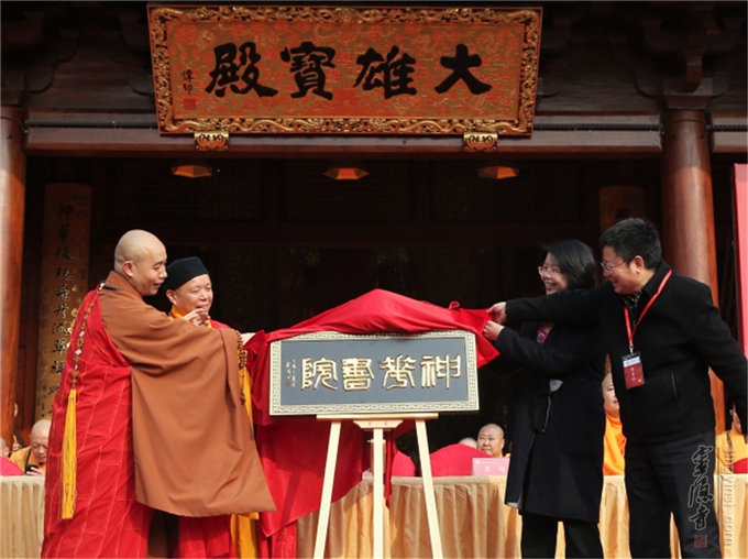 中国佛教协会驻会副会长、中国佛学院常务副院长、成都文殊院住持宗性法师,中国佛教协会副会长、江苏省佛教协会会长、镇江金焦二山住持心澄法师和无锡市副市长刘霞,江苏省民族事务委员会副主任、江苏省宗教事务局副局长、党组成员周伟文,共同为神华书院揭牌。