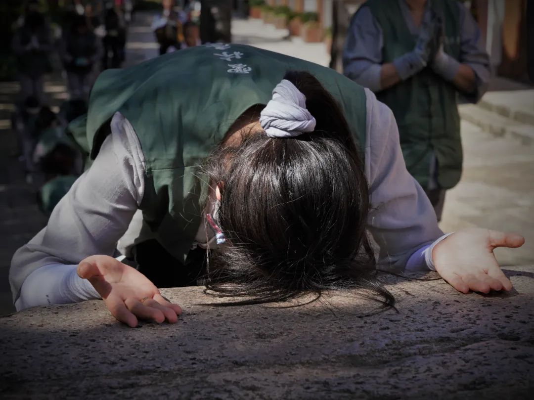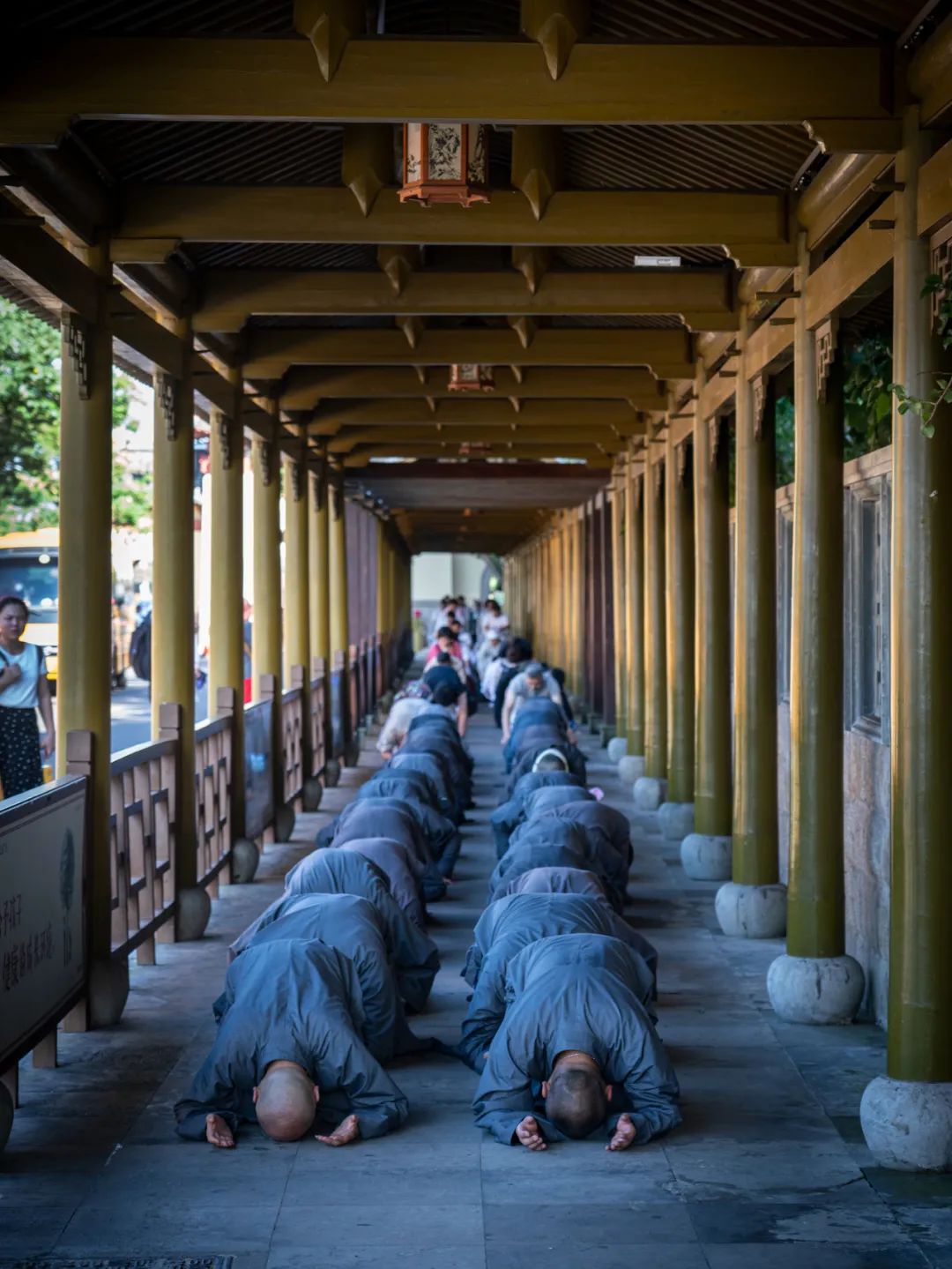 盛夏时节的普陀山,艳阳高照,热浪滚滚,朝山大众在清脆引磬声的领引下,整齐划一地三步一拜,以坚固的信心和愿力,向着观世音菩萨无尽的慈悲与智慧,努力前行。