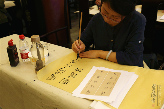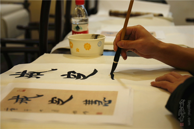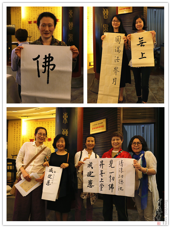 活动的主办方贴心地为大家准备了书写的纸墨还有饮用水,讲座现场的氛围布置也非常好,这样的一种公益活动能让人感到深深的人文关怀。颜老师说临摹时运笔要沉稳,这样不会有太明显的流畅连贯感,而要更加注重点画间位置经营的细微的形式美感,这也和弘一法师早年学习西洋油画的训练有关。现场稍有不足的是投影图片稍微模糊,靠后的人可能看不太清。其他方面都感觉非常好,希望灵隐寺云林书院能有更多机会举办这类活动。