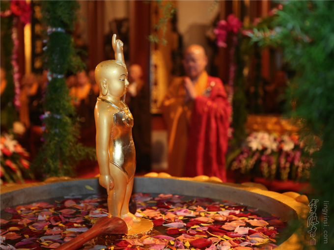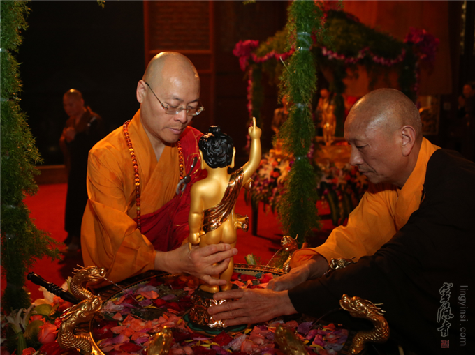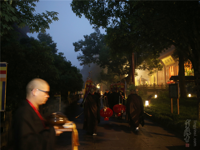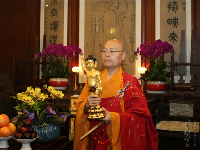 凌晨四时三十分,杭州灵隐寺钟鼓齐鸣,梵音缭绕,佛诞日浴佛祈福法会正式开始,祈福法会礼请杭州灵隐寺方丈光泉大和尚主法。