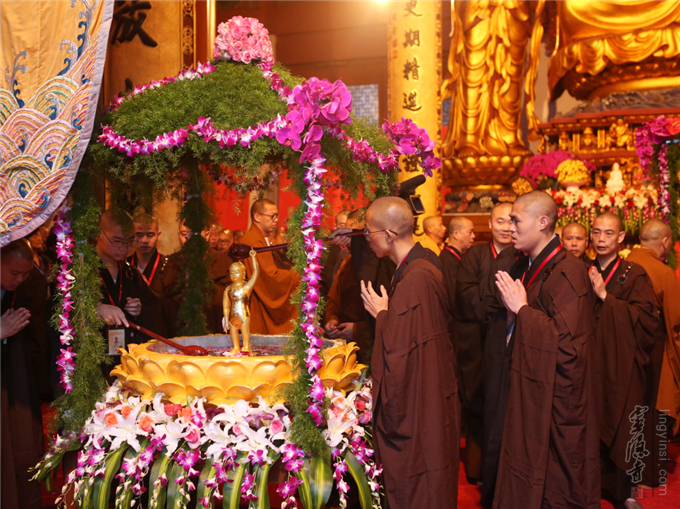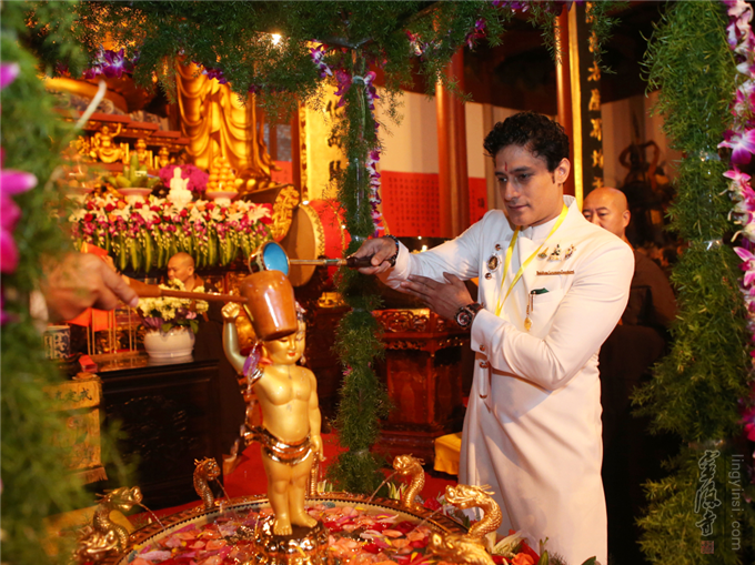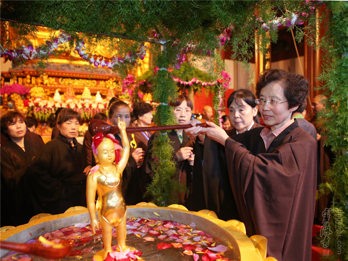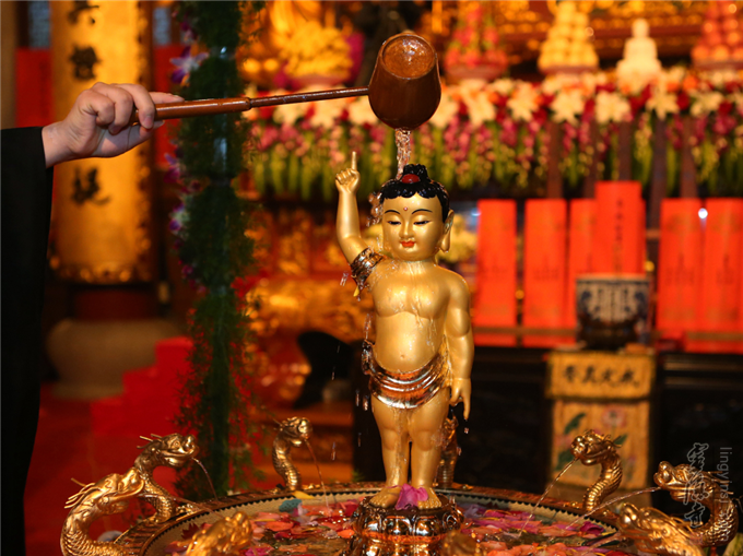 光泉大和尚三勺香汤,浴灌释迦太子金身。随后,大众法师、信众居士依次举勺,九龙圣水,次第浴佛。