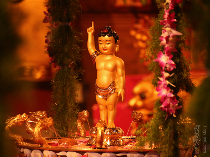 相传在2600多年前,释迦牟尼从摩耶夫人的肋下降生时,一手指天,一手指地,说"天上天下,惟我独尊。"于是大地为之震动,九龙吐水为之沐浴。