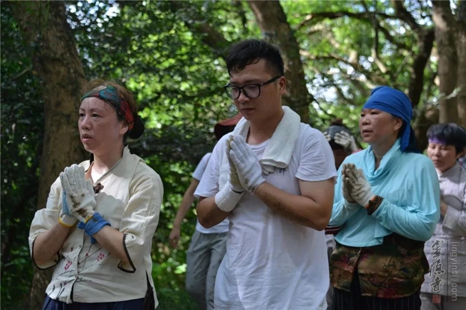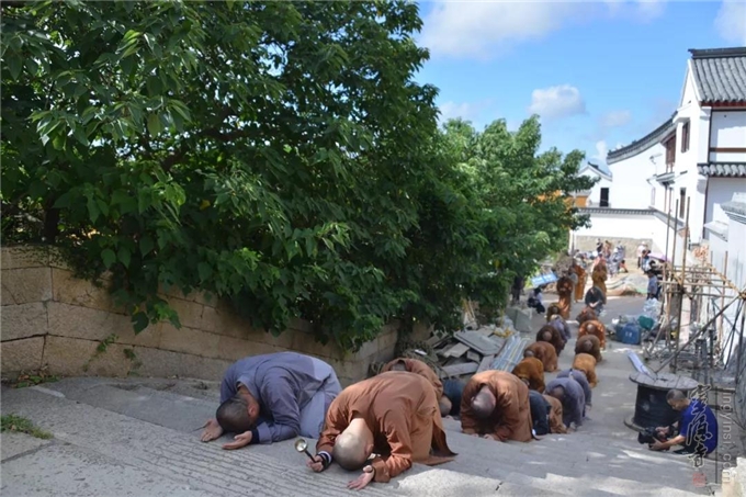 The massive group led by Venerable Master Guangquan set out from the front gate at 7:00 a.m., following the Buddhist ritual of bowing to the ground in a full prostration every three steps along the tourist pavement starting from Putuo Sacred Land via the ancient pathway of Sansheng Temple and all the way up to Puji Temple. Passers-by along the road all showed great respect and admiration as they saw the pilgrimage group. At about 11:00 a.m., they arrived at the destination—Yuantong Hall of Puji Temple, where they returned the merits to the general public by praying for blessings. This marked the successful end of the pilgrimage trip.