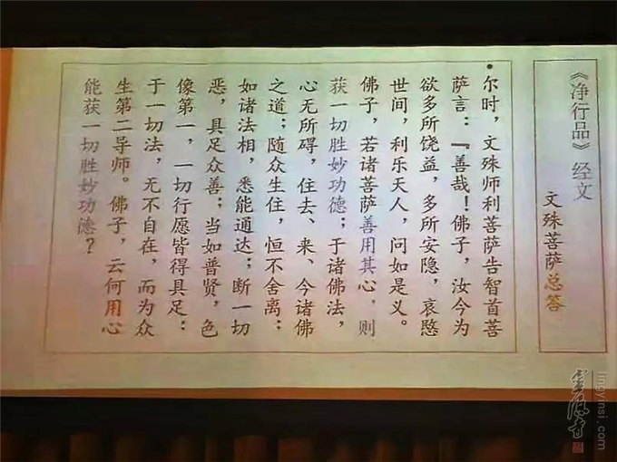 《净行品》出自《大方广佛华严经》卷第十四。这品经的大致内容是:在华严法会上,智首菩萨问文殊菩萨,如何得到清净的身口意?云何得到修行的功德,云何、云何……?