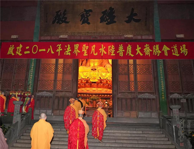 宝旛上书"启建十方法界四圣六凡水陆普度大斋胜会道场之幡"的宝旛被高高升扬。