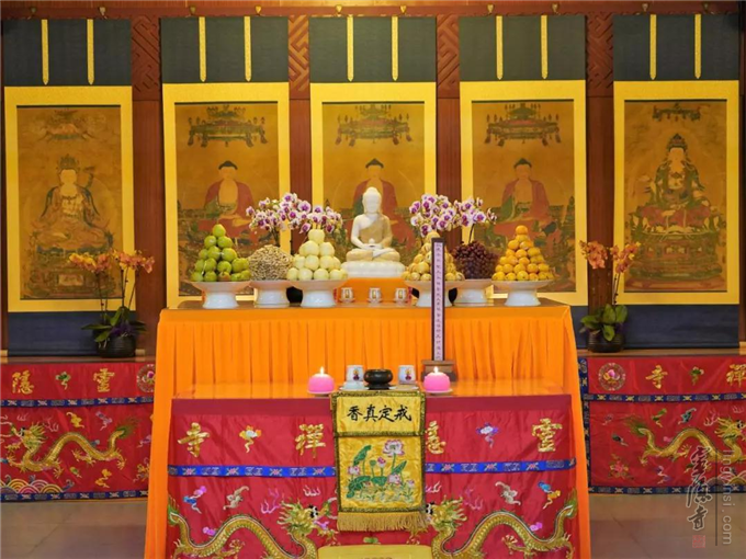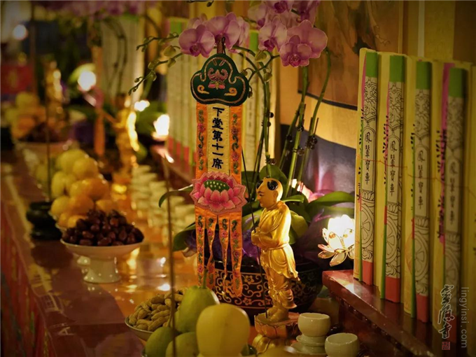 药师殿东侧高立旗幡,西侧张挂九莲宝灯,供晚间照明用,并做为地标的指引。悬幡张灯,普告三界,广召圣凡亲临法会。通过结界,使天、地、空结成三位一体的清净梵城,圣来护持,邪不能侵;以发符向天庭、地府发邀函。通过悬幡张灯,令法界有缘众生白昼了然,引孤魂暗夜来集,普受法益,共沾慧雨。