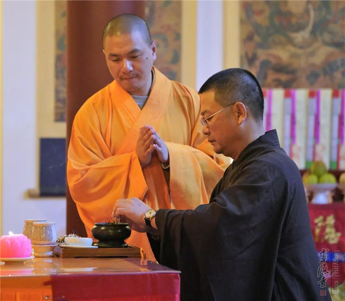 下午14时,放生佛事按仪轨在药师殿西侧平台举行。善信居士随喜参加放生仪式。法师引领众功德主依次拈香礼拜、诵念经咒,并代物命忏悔罪业、皈依三宝,令诸众生仰仗佛力加持,转生善道。