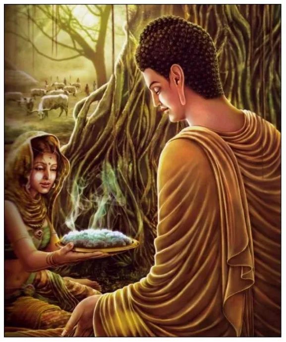 《佛本行集经》介绍说,释迦牟尼佛成道前,曾尝试过六年的苦行,不但毫无收获,反而身心疲惫,于是放弃苦行,接受了牧羊女奉献的乳糜,恢复了体力,在菩提树下静坐参悟,最终走向以智慧解脱的正道,这一天正好是农历十二月八日。由于释迦牟尼在这一天成道,因此寺院每逢这一天都用米、豆等谷物和枣、粟、莲子等干果煮粥供佛。后来,为了回报和感恩信众与施主们的供养,僧人们开始在腊八这一天向信施者赠送腊八粥,共沐佛恩。于是腊八施粥的习俗逐渐在民间盛行。