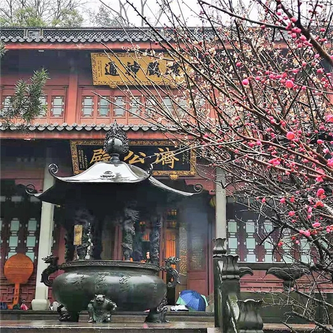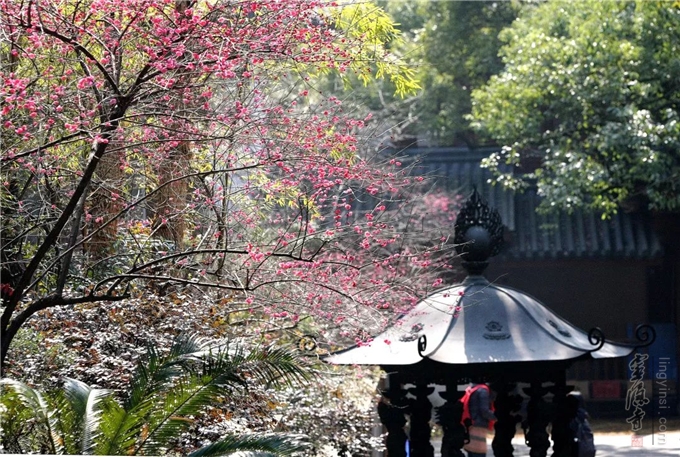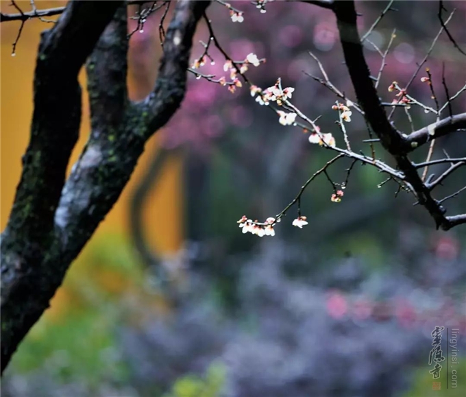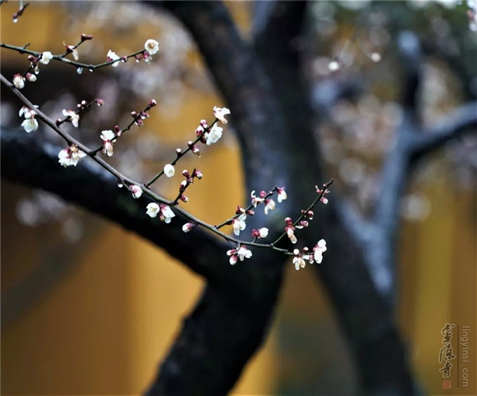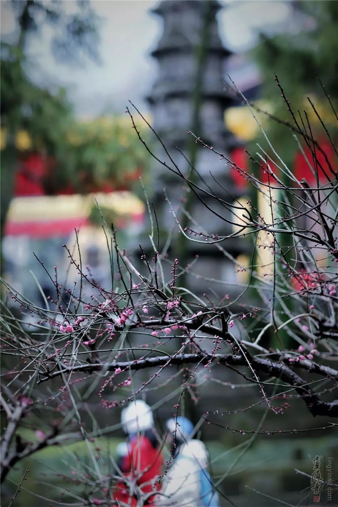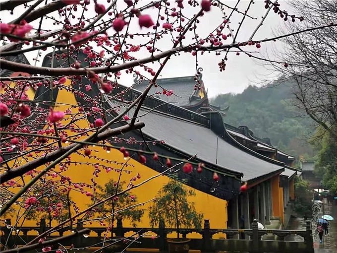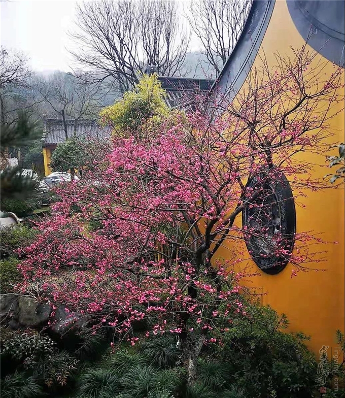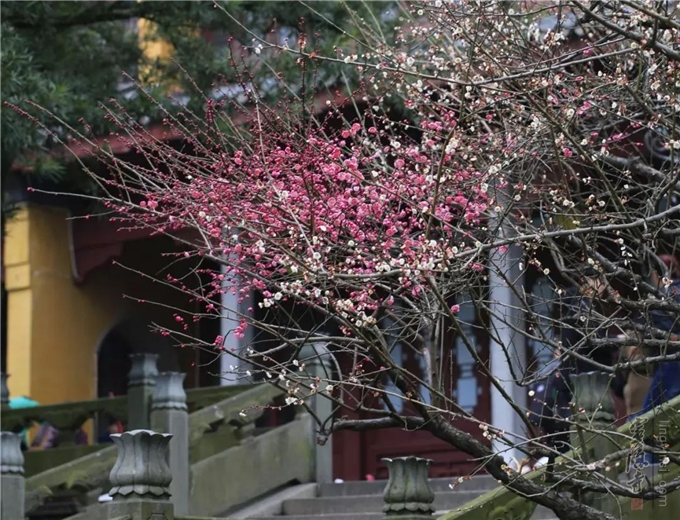 灵隐寺内种植的梅花虽不多,但株株争奇斗艳。这几天,红梅白梅交相辉映,远望灿若红霞,与黄墙黛瓦相呼相应,美不胜收!远近慕名来探梅闻香的游客,络绎不绝。正是:云林古刹梅几株,无人不道暗香来!