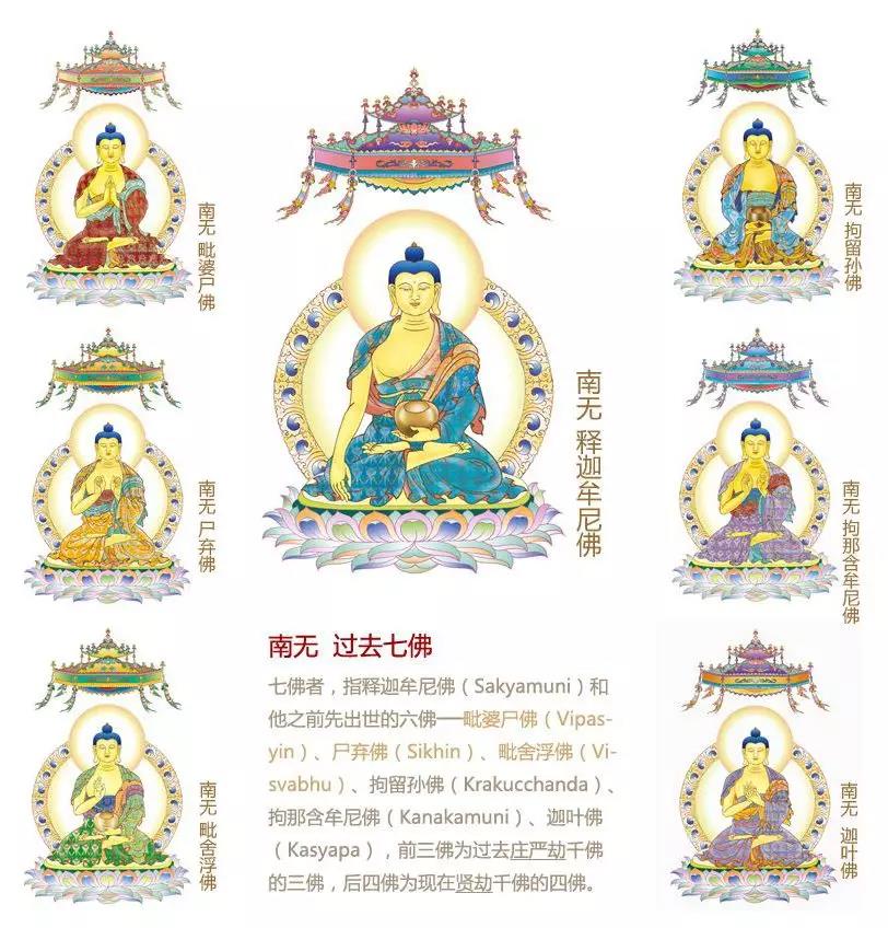 佛经里说到,释迦牟尼佛是过去七佛中的第七位佛,他以前有六尊佛,第一尊佛是出世在过去九十一劫前以前,本劫之前的庄严劫中有三佛出世,现在的贤劫中,共有千佛出世,已出世的释迦牟尼佛是贤劫中的第四尊,弥勒将是贤劫第五尊,到释迦牟尼佛为止,通称为过去七佛。他们的共同教诫是"诸恶莫作,众善奉行,自净其意,是诸佛教。"
