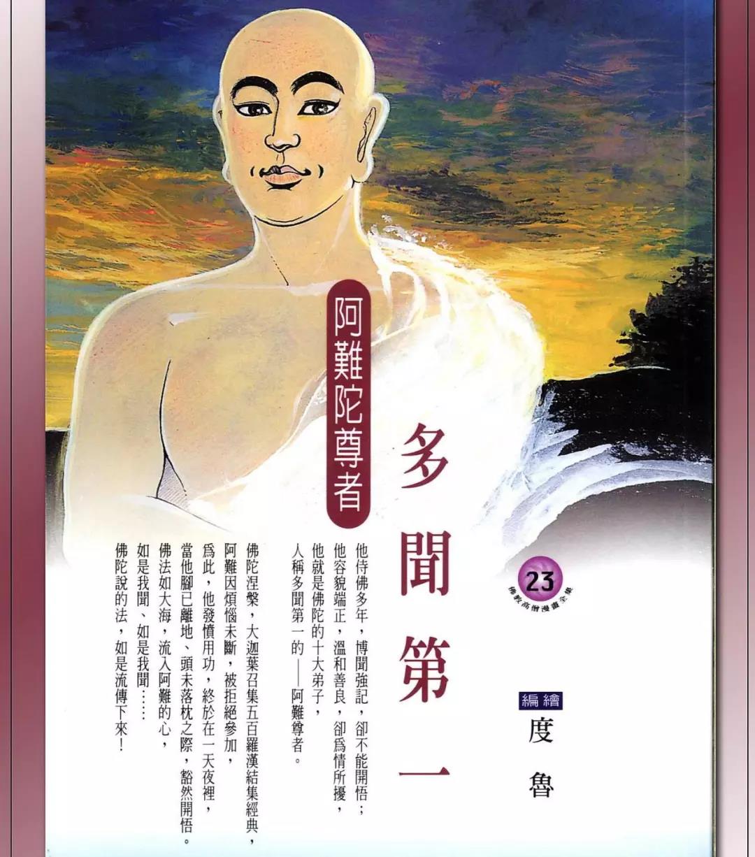 文殊菩萨曾经这样赞叹阿难尊者的庄严、多闻:"相如秋满月,眼似青莲华,佛法如大海,流入阿难心。"在佛陀十大弟子中,阿难记忆最强,仪容俊秀庄严,令见者心生欢喜。在当时僧团中年纪最轻,聪明而多闻。不但佛陀喜欢他,更有大众缘,尤其深得女众的尊敬。佛陀的姨母摩诃波阇波提夫人的出家,就是经阿难再三向佛陀请求,才得允许,于是有比丘尼僧团的成立。阿难有功于女人,所以女人也对他特别有缘,他是教团里里外外最受女人尊敬的人。