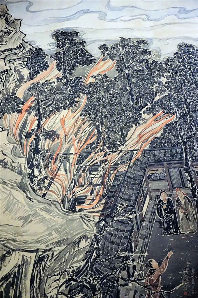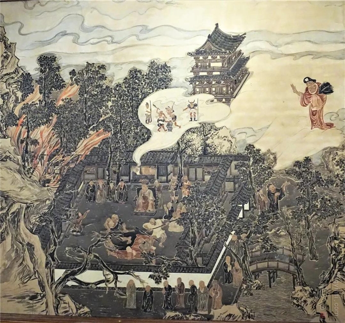 济颠叫了许久,见无人理他,遂走出来,绕著两廊,高叫:"无明发呀!无明发呀!"又叫了半晌,著了急,遂敲著各处的房门,大叫道:"无明发呀!无明发呀!"直叫到三更时分,忽罗汉堂琉璃灯烧著了旛脚,火烧起来了,及至众僧惊觉,爬起来时,早猛风随火,烈焰腾腾,已延烧到佛殿与两廊各僧房了,众僧方才慌张,忙来救火抢物,已是迟了,只急得乱跑,济颠骂道:"我叫了这半夜,都塞著耳朵不听,如今烧得这般,只可惜长老匆匆归去,不曾见得一面送他,可怜!可怜!"