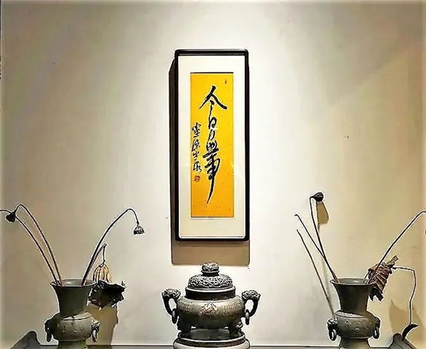 茶室中堂挂着一幅字,字体飘逸洒脱,章法一挥而就,行笔力透纸背,上书四个大字: