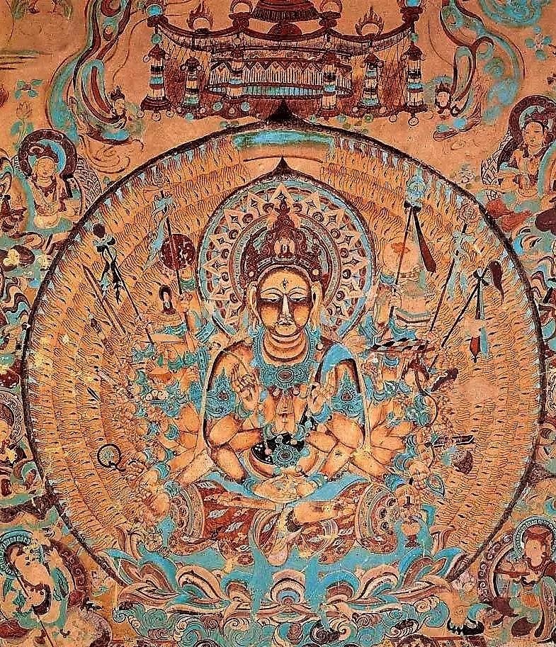 《大悲心陀罗尼经》说,观世音菩萨立誓要利益一切众生并生千手千眼,发愿后果然具足千手千眼。千手千眼,以大愿来说,是法的表相,是约数,以说明自己信愿之力,并不是固定为一千。菩萨以千手遍护众生,千眼遍观世间,象征观世音菩萨的广大慈悲和无边愿力。