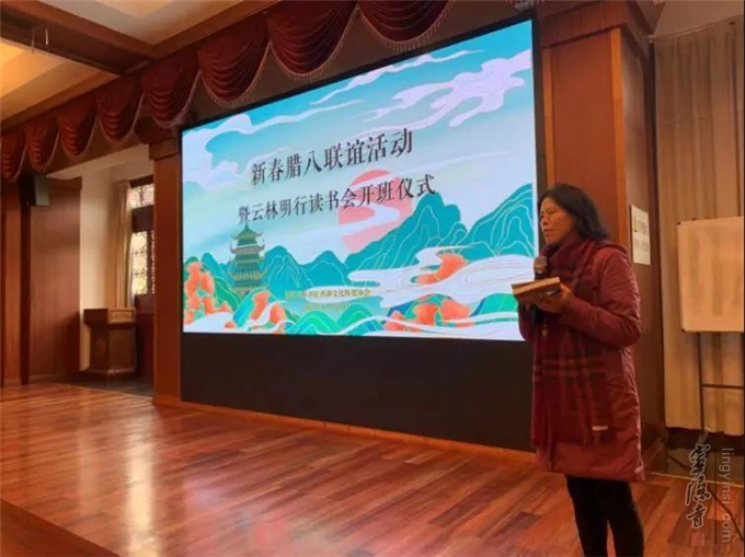 慧澄法师代表书院作欢迎辞。华丹总结汇报了2019年度云林文化走读项目的活动情况和宣布明年计划。朱素英老师主持"云林明行读书会"开班仪式并介绍读书会后续的开展规划。