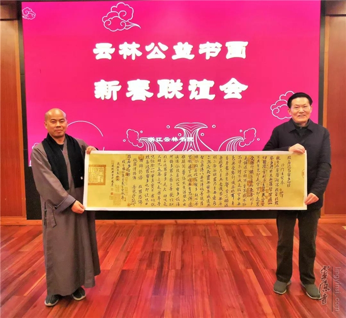 12月30日下午,云林公益书画新春联谊会在灵隐寺华严阁四楼举办,书院邀请了杭州十个合作街道的文化站代表和书画院爱好者来到联谊会现场,还有杭州佛学院艺术班的法师、杭州图书馆佛学分馆的书画作者等,共80余人参加了活动。
