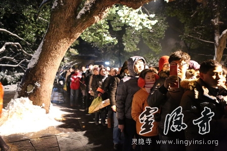 晚上10时整,灵隐寺大门打开,早已在零下的严寒中久等多时的市民们便汹涌而入。霎时间,灵隐寺内便人流如潮,大家三五成群,到各进大殿烧香礼佛,静候激动人心的蛇年新春的到来。