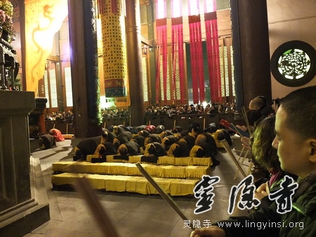 10时30分,灵隐寺法师们齐集庄严的大雄宝殿,举行新年祈福法会,虔诚祝祷新的一年国泰民安、佛法昌隆,整个法会持续了一个小时。