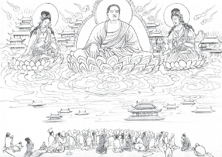 大师又问:“当云何念?”文殊菩萨开示:“此世界西,有阿弥陀佛,彼佛愿力不可思议,汝当继念,令无间断,命终之后,决定往生,永不退转。”说后,菩萨为大师摩顶,并为他授记:“汝以念佛故,不久证无上正等菩提。若善男女等,愿疾成佛者,无过念佛,则能速证无上菩提。”语讫,二位大圣互说偈颂。大师恭敬聆听,法喜充满,作礼而退。