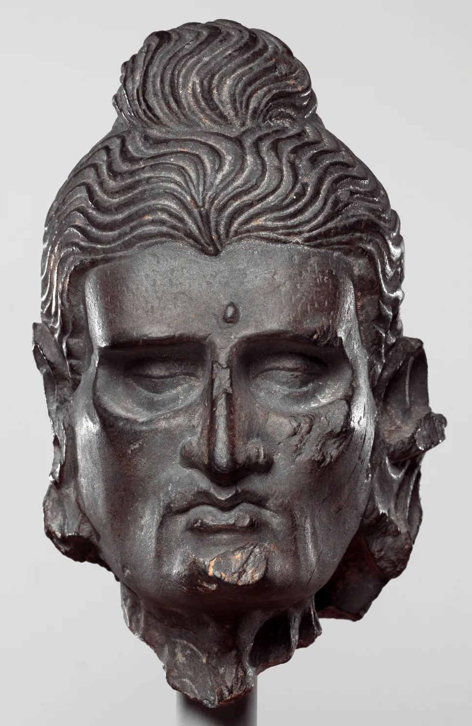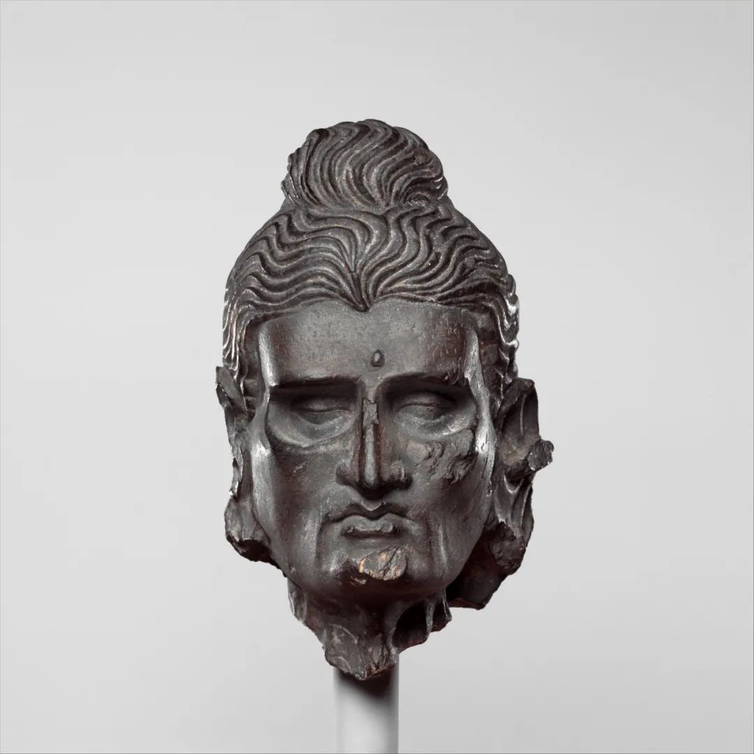 此像是3-5世纪古巴基斯坦犍陀罗地区佛像珍品;此像表现的是释迦牟尼佛未成佛前在雪山六年苦行的形貌;悉达多太子头饰螺发,宽额凸起,满脸虬须,表情刚毅庄严。双眼亦因缺少营养已经完全抠进脸庞,两只眼眶外露,却仍然炯炯有神。鼻梁直挺,双唇紧闭,似在沉思冥想。此像生动地刻画出了经文中“脊骨连露如筇竹节”的六年雪山苦行形貌。