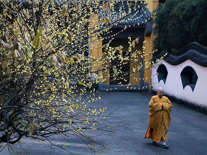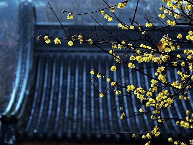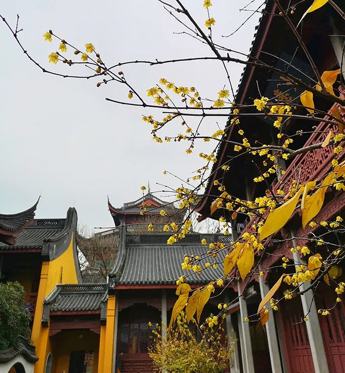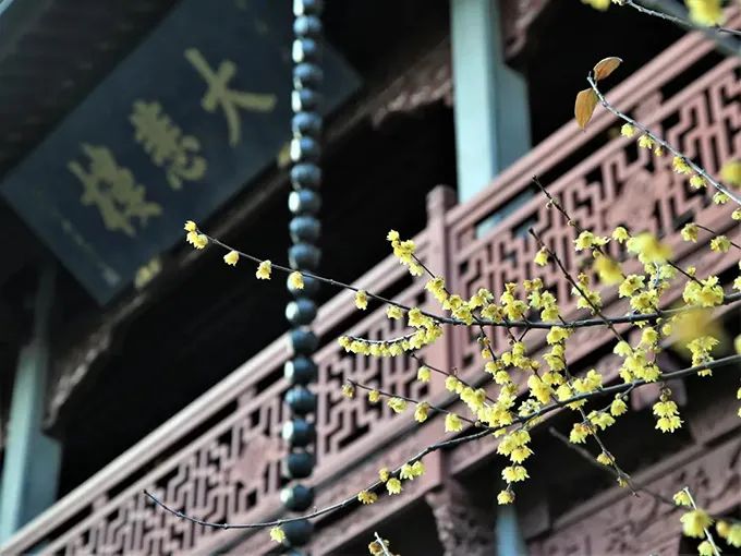 走进杭州灵隐寺, 随着一股芳香寻去,发现大雄宝殿东西两侧,各有一排腊梅在傲然绽放。小巧玲珑的小花,在阳光照耀下晶莹剔透、熠熠生辉。殿宇巍峨、古刹庄严,黄墙黛瓦,配以朵朵金黄的腊梅花,构成一幅幅精美画卷。