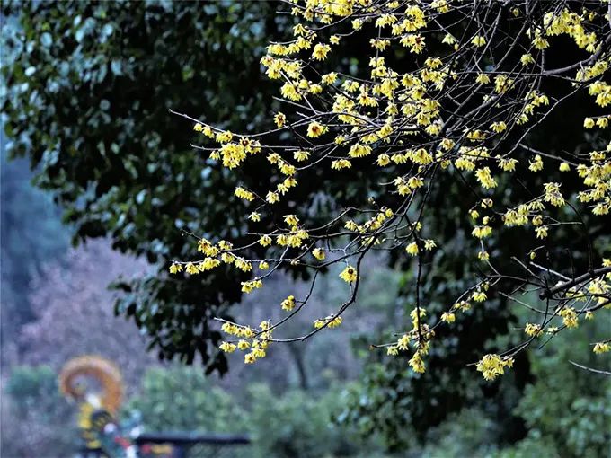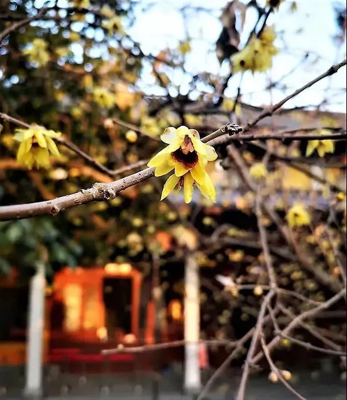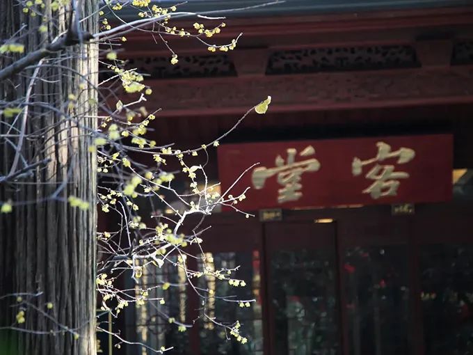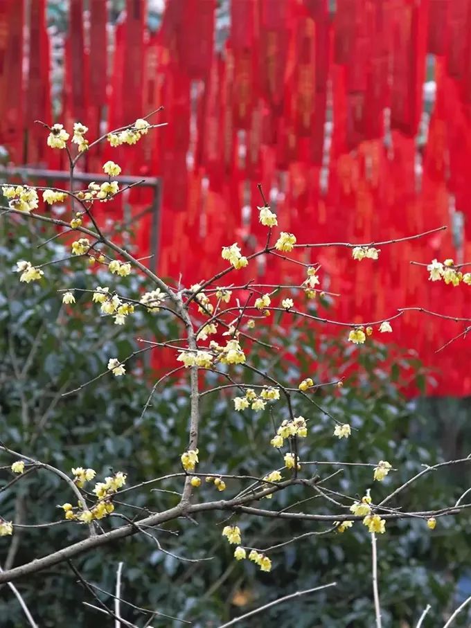 腊梅花瓣晶莹剔透,就像蜡做成的,开在寒冬腊月,不骄不躁,不疾不徐,清高孤傲,冷香凛冽。盛开的腊梅给千年古刹增添一份禅韵,引得不少游客专程前来赏花探幽。