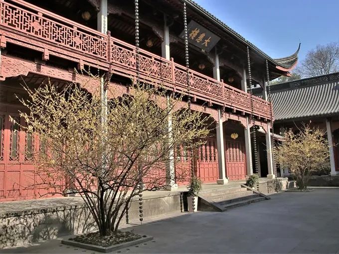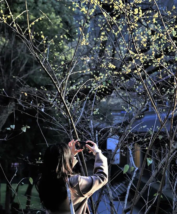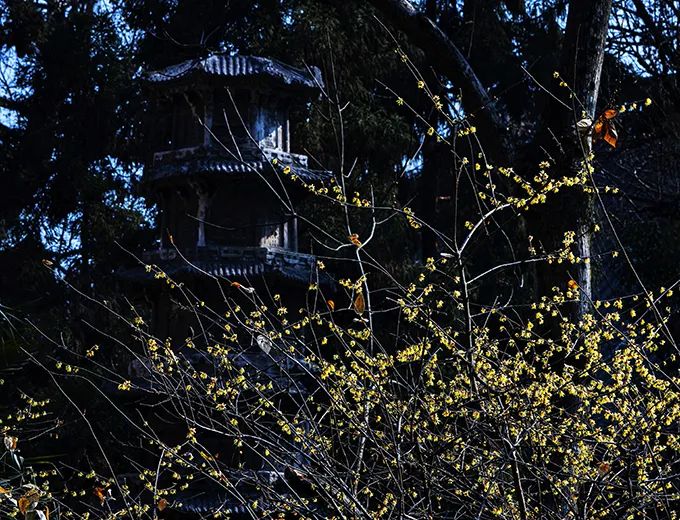 灵隐寺有两株腊梅,藏身于大雄宝殿东侧的大悲楼前(即道济禅师传奇故事中的大悲楼)。走进院内,首先闻到暗香袭来。抬头只见朵朵小黄花绽放在枝丫上,在暖阳的映射下,光分影烁,成为一片亮眼的金色。