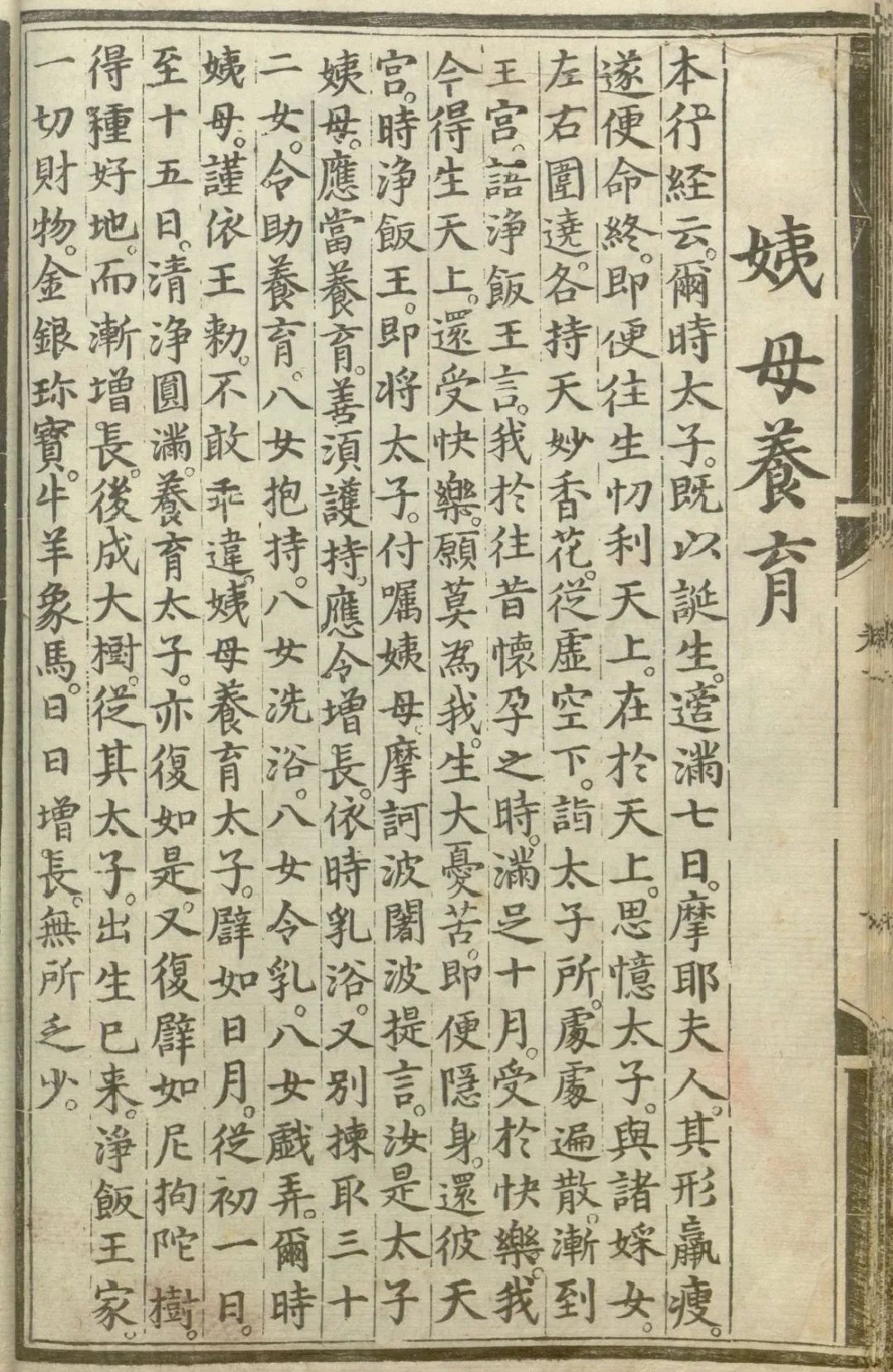 时净饭王。即将太子付嘱姨母。摩诃波阇波提言。汝是太子姨母。应当养育。善须护持。应令增长。依时乳育。又别拣取三十二女。令助养育。八女抱持。八女洗浴。八女令乳。八女戏弄。尔时姨母。谨依王勅。不敢乖违。