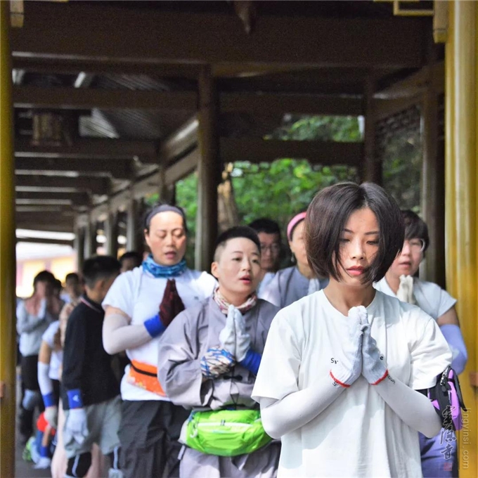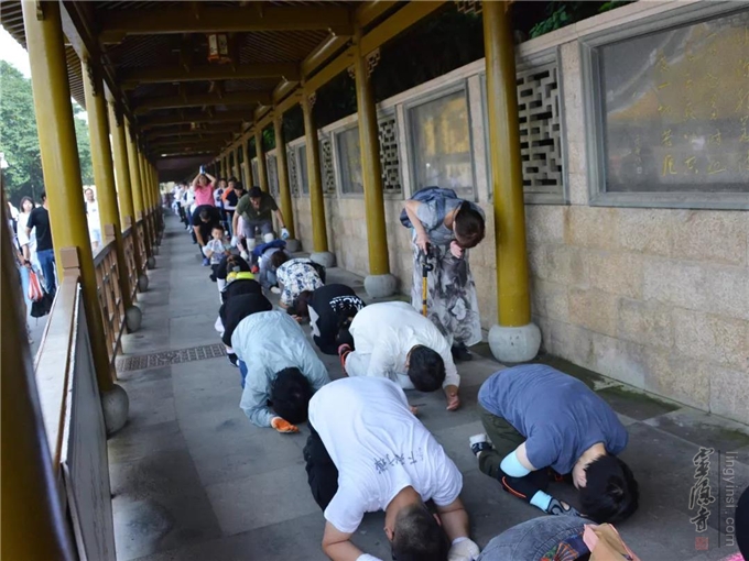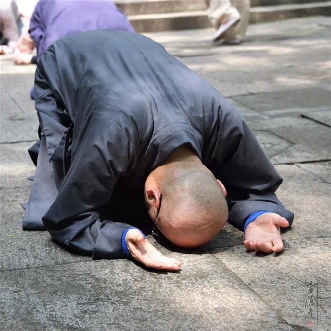 汗水迷糊了我的眼睛,膝盖渐渐痛肿,腿脚渐渐酸痛,口干舌燥的。此时上来一位年长的师兄,她告知我千万别停下来,一旦你松懈了,就不能坚持拜完。她还告知我,以前天气还要热,刮风下雨她们都坚持拜到底。这位师兄还告知我,此时正是修行时候。师兄陪着我拜了一段路,在中间喝水时我们失散了。