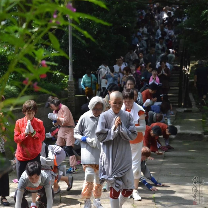 此时的我,不顾太阳晒、不顾因出汗口渴,不顾身体疲倦,听从路边志工的引导,怀着一颗无比虔诚、恭敬的心,坚定地跟着前面的师兄,坚持三步一拜拜了上去。