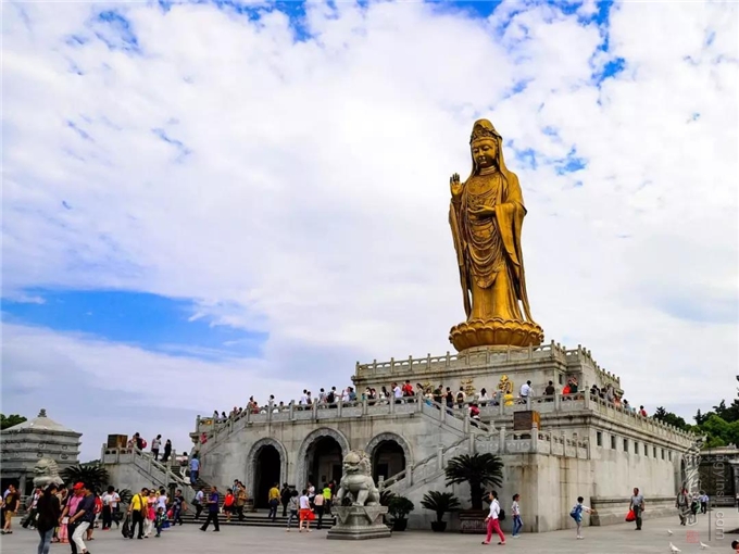 南海观音立像总高33米,菩萨脸如满月,眉目清秀,端庄慈祥,左手托法轮,右手结无畏印,显现大慈大悲相,为海天佛国的象征。