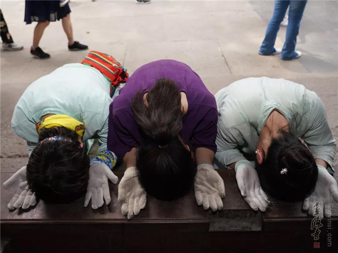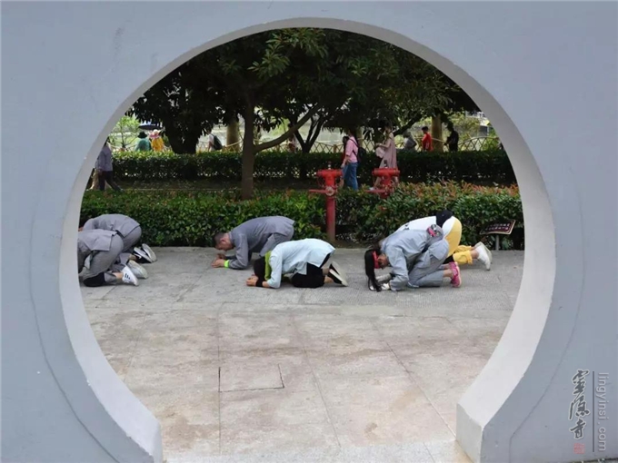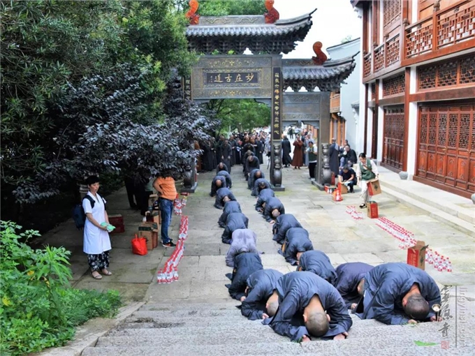 清脆的引磬,领引着四众弟子,整齐的拜山队伍,三步一拜朝礼观世音菩萨,沿途见闻者无不肃然起敬,欢喜赞叹,恭敬观礼。